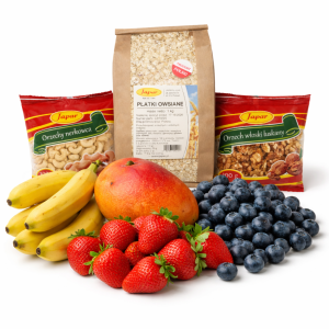 Znajdziesz w nim płatki owsiane, świeże owoce i chrupiące orzechy — idealne do owsianki, smoothie bowl i fit przekąsek.